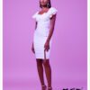 A sleek black satin gown with a structured strapless corset bodice, deep plunge neckline, and intricate ruched detailing. The dress features a dramatic high slit with sparkling embellishments and a flowing train, exuding confidence and red-carpet glamour.