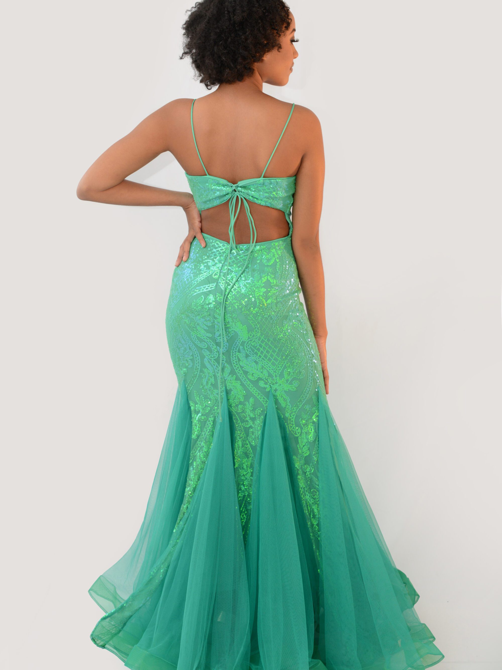 A vibrant green mermaid-style gown with intricate beaded detailing and a sheer tulle flare at the bottom. The dress features a delicate spaghetti strap design, a fitted bodice that enhances curves, and a dramatic floor-length silhouette.