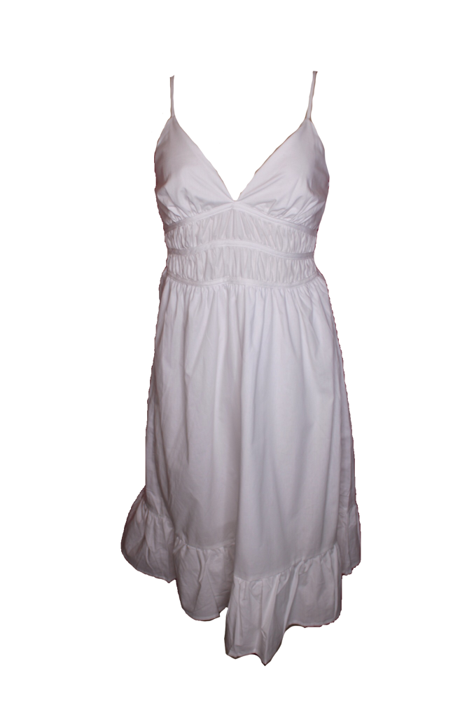 A white sleeveless midi dress with spaghetti straps, ruched bodice, and ruffled hem.