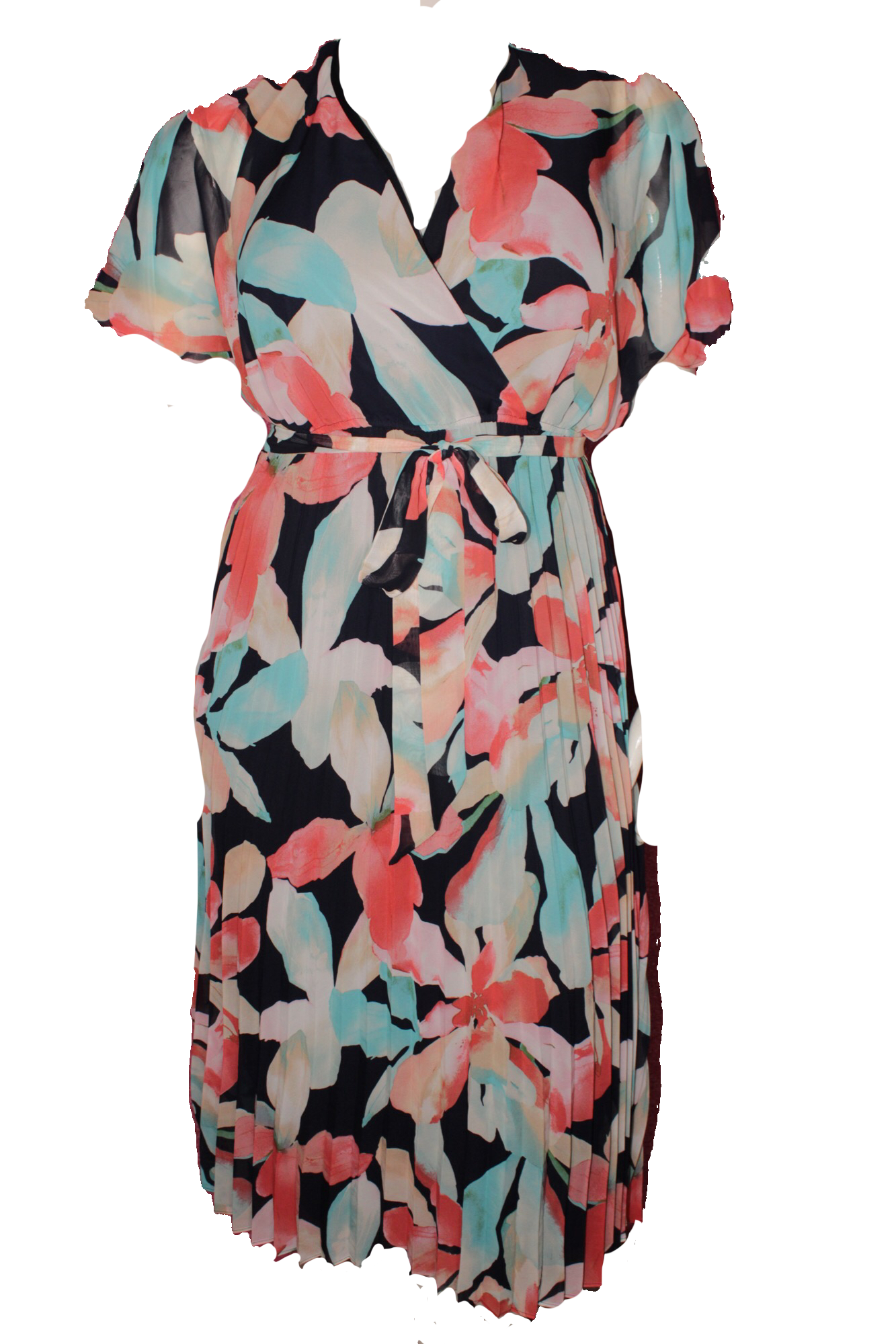 A knee-length pleated wrap dress with short sleeves and a tie waist, featuring a bold abstract floral pattern in coral, teal, ivory, and black.